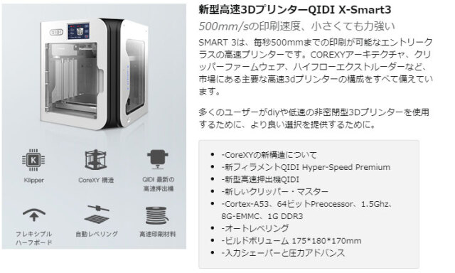 QIDI TECHNOLOGY/チーディーテクノロジー 3Dプリンター 新モデル:X-Smart3 3Dプリンター 500mm/s高速デスクトップfdm 3Dプリンター 初心者向け、CoreXY&クリッパー、オートレベリング、インプットシェイパー、ビルドサイズ175x180x170mm